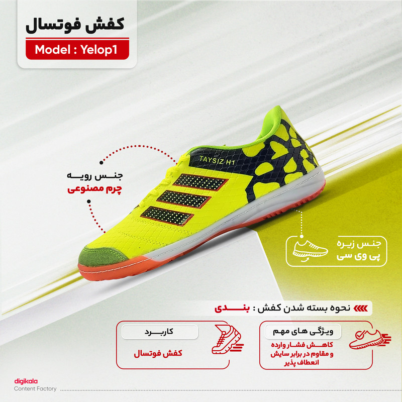 کفش فوتسال مردانه مدل Yelop1، ترکیبی از طراحی مدرن و کارایی بالا است. با بندی کلاسیک، این کفش امکان تنظیم دقیق و راحتی را برای پا فراهم میکند. جنس چرم مصنوعی بالای کفش، ظاهری شیک و مقاومت در برابر ساییدگی را به ارمغان میآورد. زیره کفش از جنس پیویسی با ویژگیهایی چون آجدار بودن، انعطافپذیری، قابلیت ارتجاعی، کاهش فشار وارده به پا و مقاومت در برابر سایش، برای بازیکنان فوتسال ایدهآل است. کفی کفش با قابلیت ارتجاعی و طراحی ساده، همراه با قابلیت گردش هوا، اطمینان از راحتی و خنکی پا در طول بازی را فراهم میکند. ویژگیهای تخصصی کفش شامل مقاومت در برابر سایش، قابلیت گردش هوا و کاهش فشارهای وارده به پا، به بازیکن اجازه میدهد تا با اطمینان بیشتری حرکت کند و از بازی لذت ببرد. در مجموع، کفش فوتسال Yelop1 با توجه به نیازهای بازیکنان فوتسال طراحی شده است تا عملکرد آنها را بهبود ببخشد و تجربهای لذتبخش از بازی را ارائه دهد. این کفش، انتخابی عالی برای کسانی است که به دنبال کیفیت، دوام و راحتی هستند.